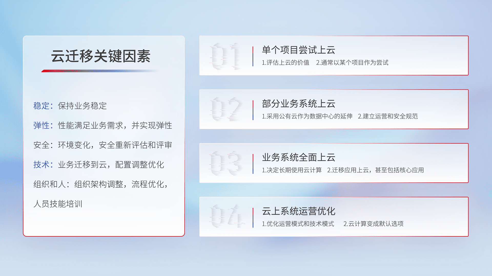 结合实际业务,,,从规划设计、、云平台选型、、云原生改造、、、数据迁移、、、集成交付,,,迁移全过程为客户识别最佳上云路径,,,,做好风险识别管理,,设计网络架构、、身份权限、、、、安全审计合规、、操作审计、、、、日志审计、、、监控告警策略、、、、多站点容灾设计等,,,对云上基础设施进行整体规划,,,提升IT治理水平,,以满足弹性、、、高可用、、、高性能的需求。。。。