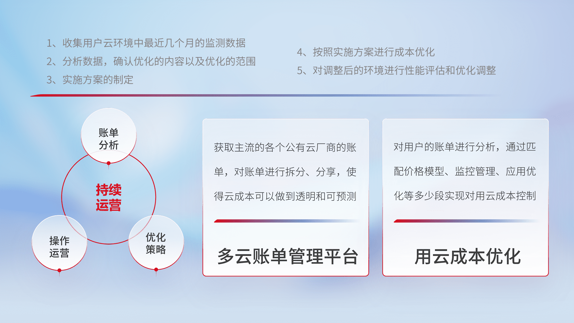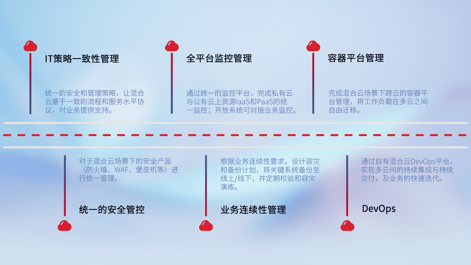 通过多云纳管,,,以统一的资源数据模型把客户的云资源进行抽象和封装,,进而实现对多云资源的统一操作,,,保障云资源管理的可靠性、、、、稳定性与可用性。。。。量身定制化运维内容,,,,配置、、、、开发运维、、补丁管理、、、备份、、监控、、、认证和访问管理、、、审计和日常巡检等,,,,保障在用云过程中的可靠度,,,稳定度以及高可用率。。。。